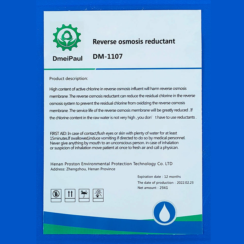 普罗斯顿环保 反渗透还原剂DM-1107 一、产品特点 ·原水中活性氯含量过高,会氧化反渗透膜,减少膜的使用寿命; ·本还原剂为液体,可直接在现场使用,使用方便,易于控制添加量; ·反渗透预处理阶段会加入氧化性杀菌剂来控制微生物,会使活性氯含量升高,需要使用 还原剂。