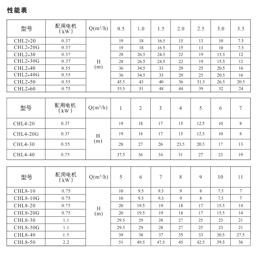 • CHL2-20‌:电机功率0.37kW,流量0.55m³/h,扬程34m。